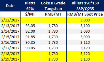 Below daily prices of Platts 62% index / Coke / Billets for your information.