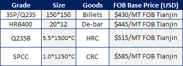 SMU Note: $515/MT hot rolled = $467.20 per net ton FOB Tianjin. Chinese hot rolled is not allowed in the U.S. due to past dumping suits.