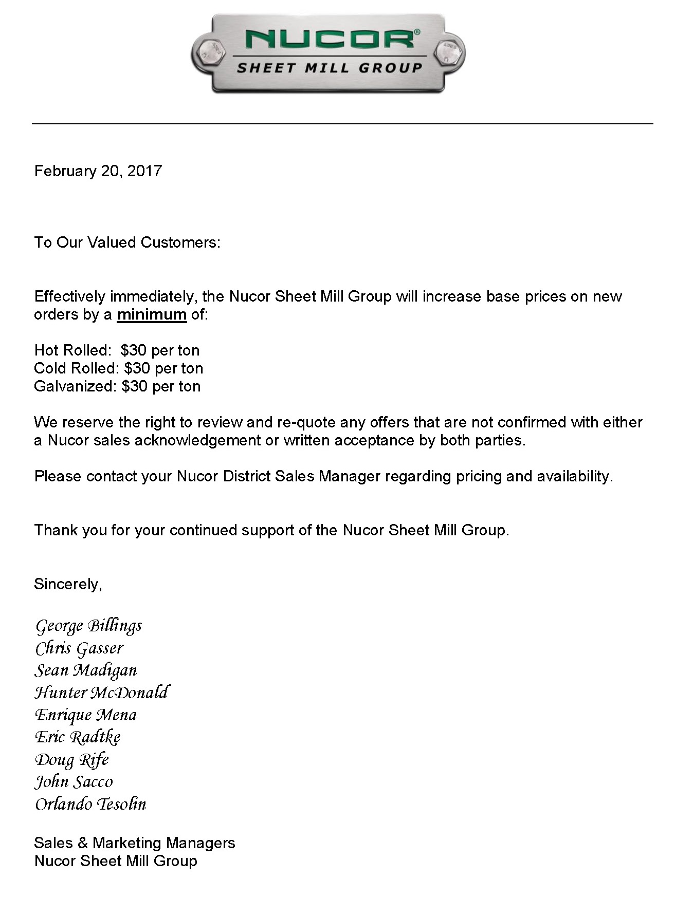 On Monday morning Nucor made it official and was the first mill to announced a $30 per ton ($1.50/cwt) price increase on flat rolled steel. The increase was made in the form of a letter emailed to their customers. No explanation was provided by the mill to their customers for the reasoning behind the steel sheet price increase.