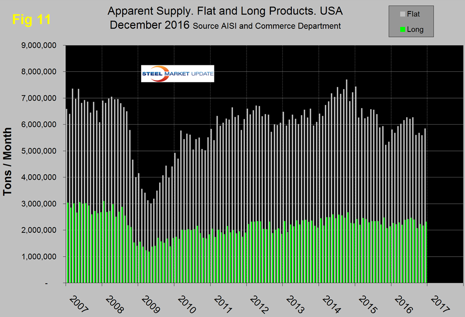 SMU Comment: In Figures 2, 4, 5 and 6, the white lines show t/d shipments. There was a decline in shipments for total carbon steel products since mid-2014 but the y/y decline halted in January this year. Figure 11 shows the total supply to the market of long and flat products based on AISI shipment and import data through December which is the latest data available.