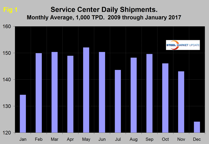 Total service center carbon steel shipments increased from 116,600 tons in December to 151,500 in January on a per day basis. MSCI data is quite seasonal and we need to get past that before commenting in detail on current results. Figure 1 demonstrates this seasonality and why comparing a month’s performance with the previous month is usually misleading.
