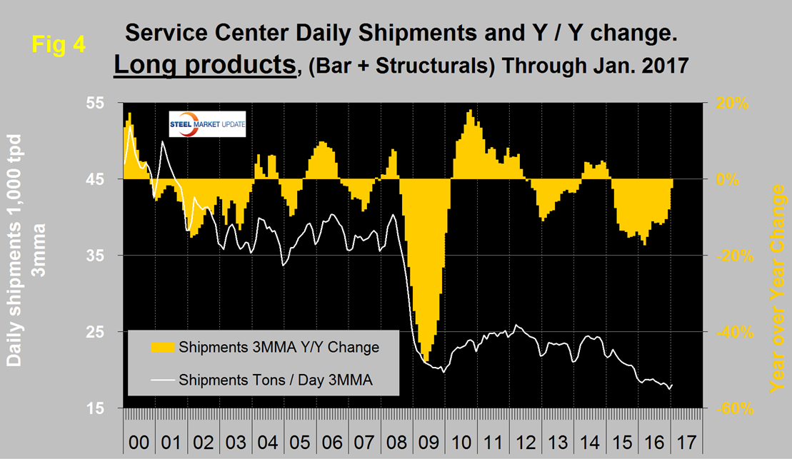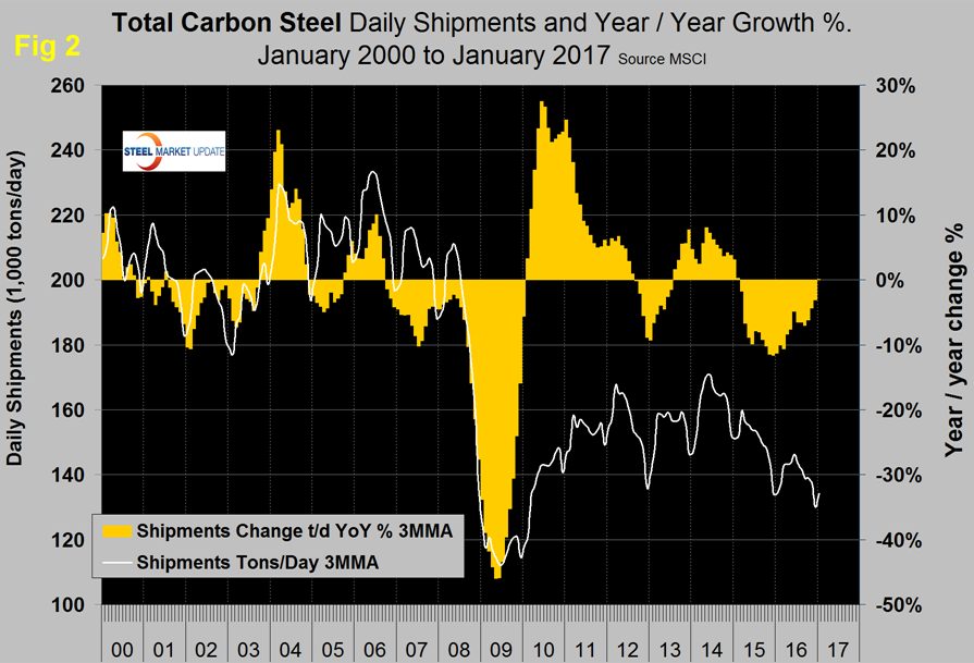 We then calculate the percent change between January 2017 and January 2016 and with the most recent 3 year January average. January this year was up by 4.2 percent in January 2016 but was still down by 0.6 percent from the three year January average. The fact that the single month y/y growth comparison is better than the three year comparison suggests that momentum is positive. In January 2015 the MSCI expanded their data to include sub sets of the major product groups and provided two years of data for 2014 and 2015. Table 1 shows the breakdown of sheet products into hot rolled, cold rolled and coated products on the same basis as for the other major product groups. Shipments of all products except carbon pipe and tube were up from January last year. Figure 2 shows the long term trends of daily carbon steel shipments since 2000 as three month moving averages (in our opinion the quickest way to size up the market is the brown bars in Figures 2, 4, 5 and 6 which show the percentage y/y change in shipments).