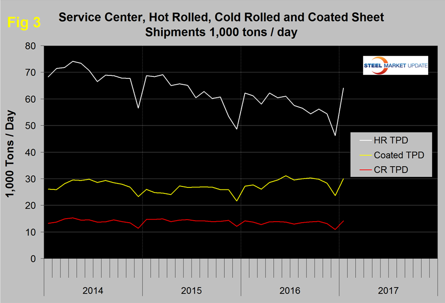 In January on a 3MMA basis there was positive y/y growth of 0.07 percent. As small as this was, it was the first positive y/y result since February 2015. Figure 3 shows the shipment history since January 2014 of the three major sheet products. All three improved in January led by HRC. These are single month results, not 3MMA.