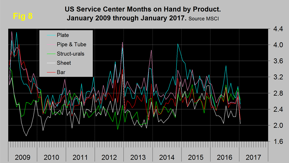 January closed with months on hand (MoH) of 2.15 for all carbon steel products, which was down from 2.76 at the end of December. The actual inventory tonnage increased by 1.1 percent but the MoH declined so much because of the shipment increase. All products except structurals and coated sheet had a decrease in MoH year over year with HRC down by 18.5 percent and tubulars down by 18.0 percent. Figure 8 shows the MoH by product monthly since January 2009.