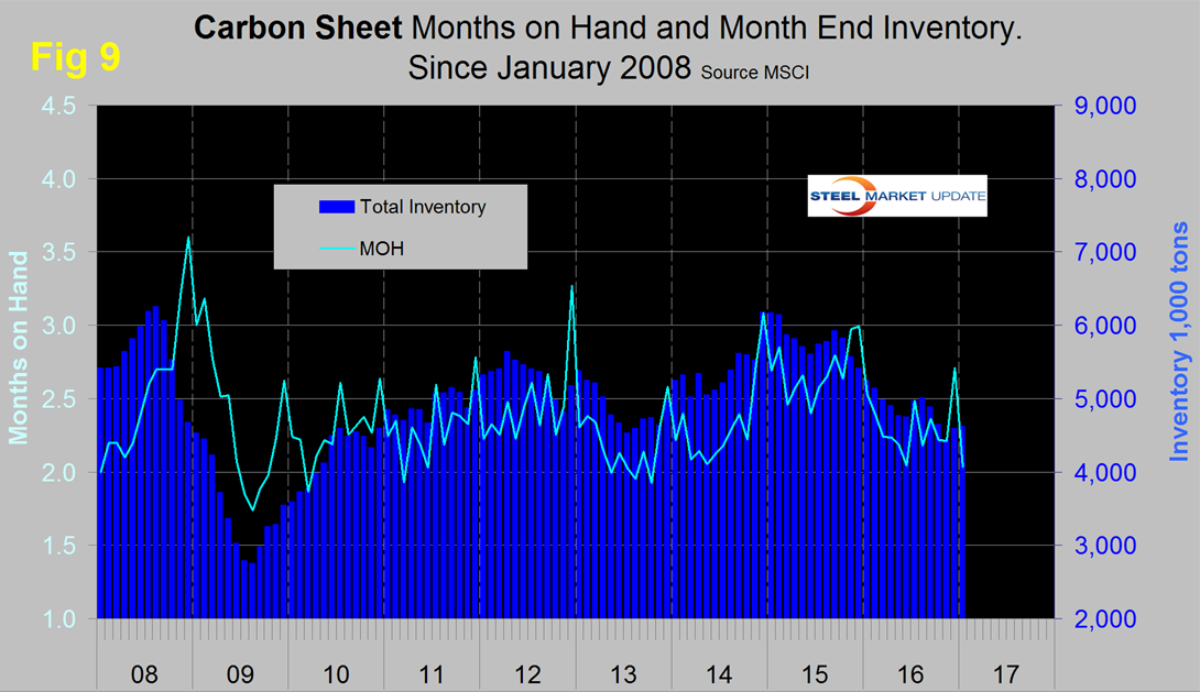 All products had a surge in months on hand in July 2016 driven not by an inventory volume increase but by a decrease in monthly shipments as a result of a small number of shipping days. This does not break the individual sheet products out separately. Figure 9 shows both the month end inventory and months on hand since January 2008 for total sheet products.