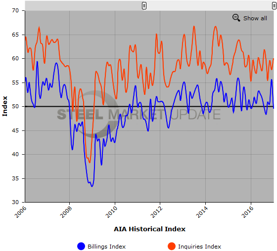 Below is a graph showing the history of the Architecture Billings Index and Inquiries Index. You will need to view the graph on our website to use its interactive features, you can do so by clicking here. If you need assistance logging into or navigating the website, please contact our office at 800-432-3475 or info@SteelMarketUpdate.com.