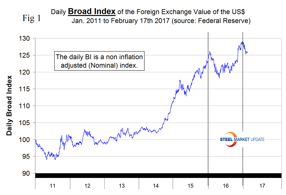 The Broad Index value of the US $ is reported several days in arrears by the Federal Reserve, the latest value published was dated February 17th (Figure 1).