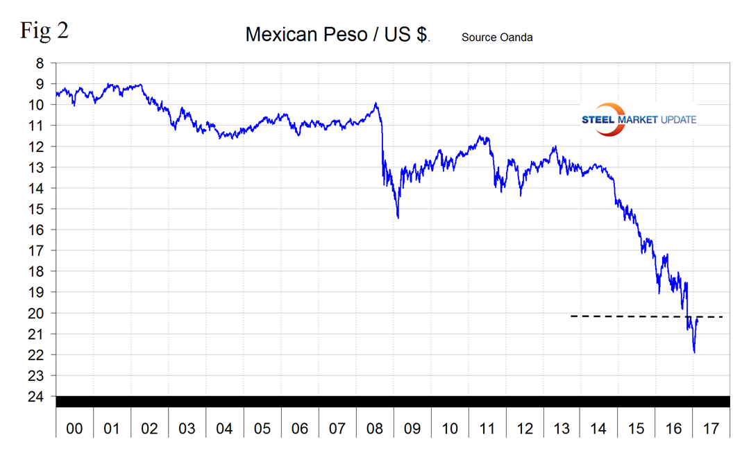 Two days after the US election the peso broke through the 20/US $ level for the first time ever and continued to decline until January 19th when it reached 21.9211/US $. Since then the peso has recovered to reach 20.3762/$ on February 21st (Figure 2.)