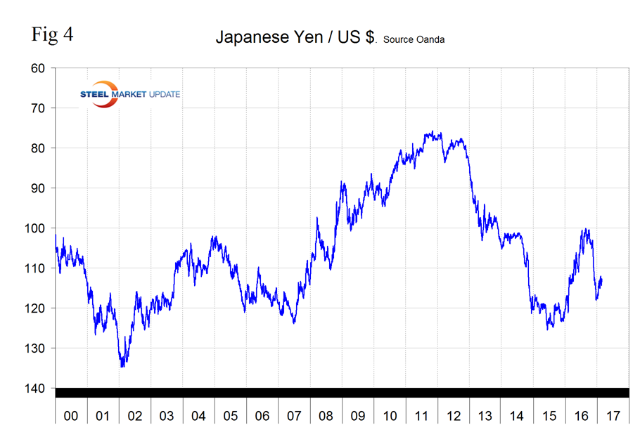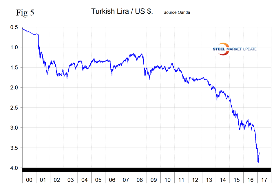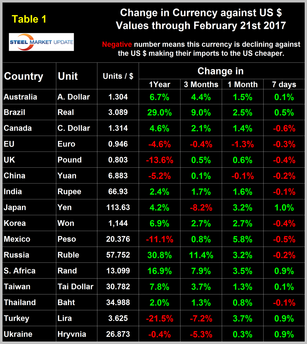 To illustrate the volatility of the currencies of the steel trading nations we at SMU have included in this report, two versions of Table 1, each of which shows the value of the US $ measured in the currencies of 16 steel and iron ore trading nations. It reports the changes in one year, three months, one month and seven days for each currency and is color coded to indicate strengthening of the dollar in red and weakening in green. We regard strengthening of the US Dollar as negative and weakening as positive because the effect on net imports. The December 26th version of Table 1 has the $ strengthening against 15 of the 16 currencies at the 3 month level.