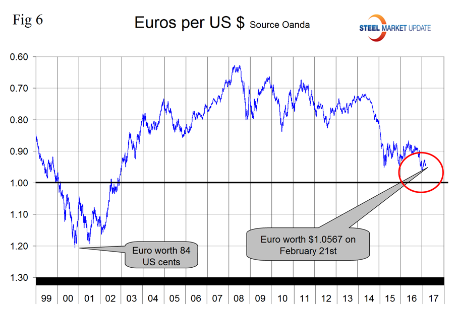 There may be signs of another reversal to the upside at the 7 day level where the dollar strengthened against 9 of the 16. This seems to illustrate major uncertainty on the part of traders who are whipsawed by comments from both the Fed and our leading politicians. In each of these reports we comment on a few of the 16 steel trading currencies listed in Table 1. Charts for each of the 16 currencies are available through February 21st for any premium subscriber who requests them. We also include writings from experts who we regard as credible to explain some of the currency moves that we are living through.