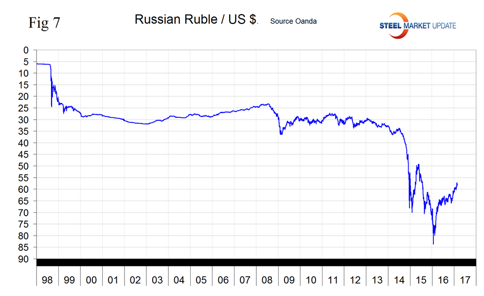 The Ruble bottomed out at 83.67/US $ on January 21st last year. Since then it has gained 30.97 percent to reach 57.7522/US $ on February 21st this year (Figure 7).
