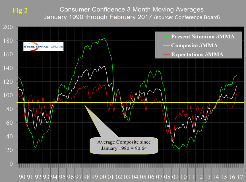 SMU Comment: The surge in expectations is particularly encouraging as it will drive personal consumption which is the largest component of GDP. This is turn will have a positive effect on steel consumption. At the present rate, consumer confidence will exceed the previous peak that occurred just before the recession in the next few months.