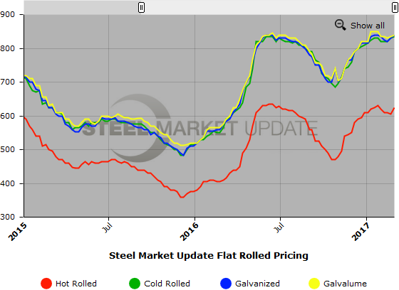 SMU Note: Below is a graphic showing our hot rolled, cold rolled, galvanized, and Galvalume price history. To use the graphs interactive capabilities, you must view it on our website here. If you need help navigating the website or need to know your login information, contact us at info@SteelMarketUpdate.com or by calling 800-432-3475.