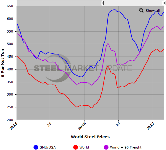Below is a graph comparing SteelBenchmarker world HR export prices against the SMU domestic HR average price (we will build new data using Platts and replace the SteelBenchmarker data once we have collected a sizable history). We also have included a comparison with freight and traders’ costs added which gives you a better indication of the true price spread. You will need to view the graph on our website to use it’s interactive features, you can do so by clicking here. If you need assistance with either logging in or navigating the website, please contact us at 800-432-3475 or info@SteelMarketUpdate.com.