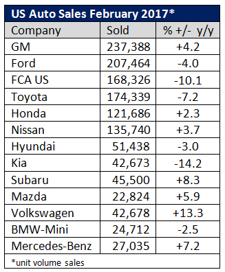 Automotive sales slowed overall in February. Ford and FCA saw declines of 4 and 10 percent, respectively. There were still some strong sales among auto manufacturers, notably, GM up 4.2 percent, Nissan 3.7 percent, Subaru 8.3 percent, Mercedes-Benz 7.2 percent, and Volkwagen Group up 13.3 percent year-over-year.