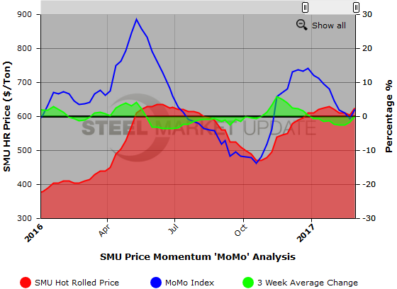 The graph below demonstrates the relationship between the SMU hot rolled coil price, the SMU Price MoMo Index, and the three week moving average change in the MoMo Index. Click here to view and interact with it on our website. As published in our Tuesday evening newsletter, the latest SMU HRC price range is $610-$640 per ton with an average price of $625, up $20 over the previous week.