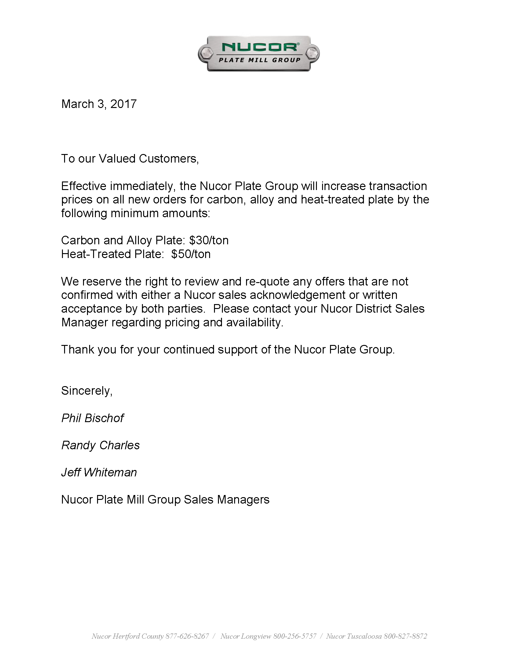 Up until today, Tte other plate mills had been silent since the Nucor announcement which could be nothing more than those mills wanting to have a clearer picture of ferrous scrap prices for March before making any pricing moves.