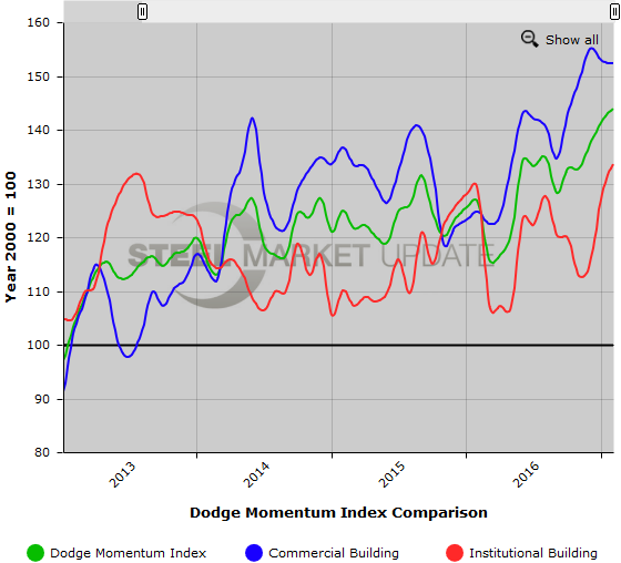 Below is a graph showing the history of the Dodge Momentum Index. You will need to view the graph on our website to use its interactive features, you can do so by clicking here. If you need assistance logging into or navigating the website, please contact our office at 800-432-3475 or info@SteelMarketUpdate.com.