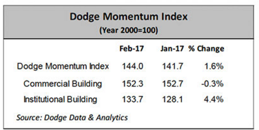 The Dodge Momentum Index jumped 1.6 percent to 144.0 in February. The index, a measure of the initial planning for nonresidential building projects, made the gain from January due to an increase in institutional building activity.