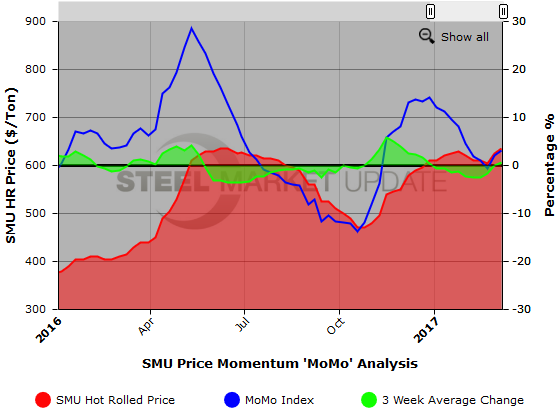 MoMo was measured at +3.04 percent this week, meaning that the current HRC price is higher than the average price over the last 12 weeks.