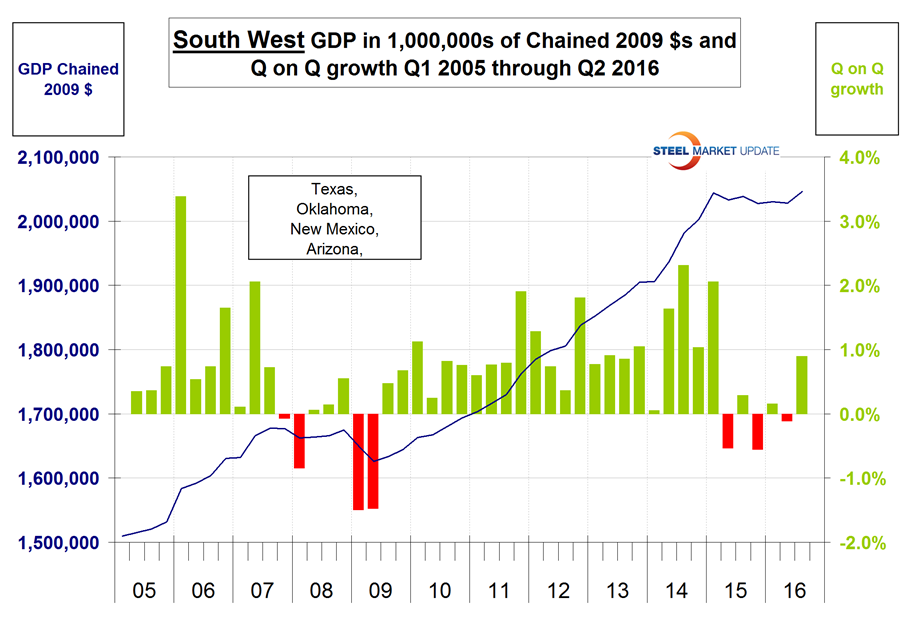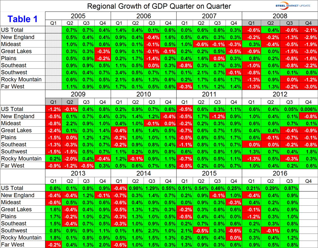 The Bureau of Economic Analysis (BEA) introduced a new data set for GDP by state and region in 2014 and backdated it to Q1 2005. This week the data was updated through Q3 2016. Even though we might consider this to be historically “old,” we think it’s worth reporting because it is a foundation for where we are now. The data is published quarterly and is reported in chained 2009 dollars seasonally adjusted. We at SMU analyze the data and report to our subscribers quarterly by region. Should anyone wish to see data and graphs for an individual state, we will supply on a one off basis. Table 1 show the growth of regional GDP in chained 2009 dollars quarter on quarter (these numbers are not annualized as is the case for published reports of the growth of national GDP.)