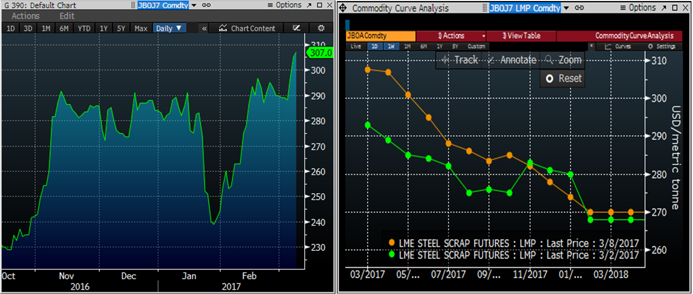 LME scrap futures have continued to move higher with April settling at $307/t yesterday, the highest since May, 2016. March’s domestic scrap settlement pop prompted Nucor to raise flat rolled prices $30/st yesterday following their February 20th price hike announcement.