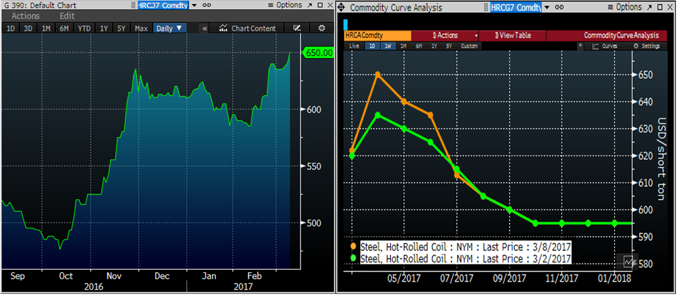 The sharp sell-off in scrap prices at the end of January looks to be long forgotten as domestic flat rolled prices have continued the rally started in mid-October, 2016. Midwest hot rolled is now at the highest price since the end of 2014. The front of the CME HRC futures curve moved up $10-$15/st over the past five trading days. Last night, April futures settled at $650/st. May and June traded $640/st today. The curve remains steeply backwardated or downward sloping with Q3 trading in the $605-$610 range and Q4 at 595.