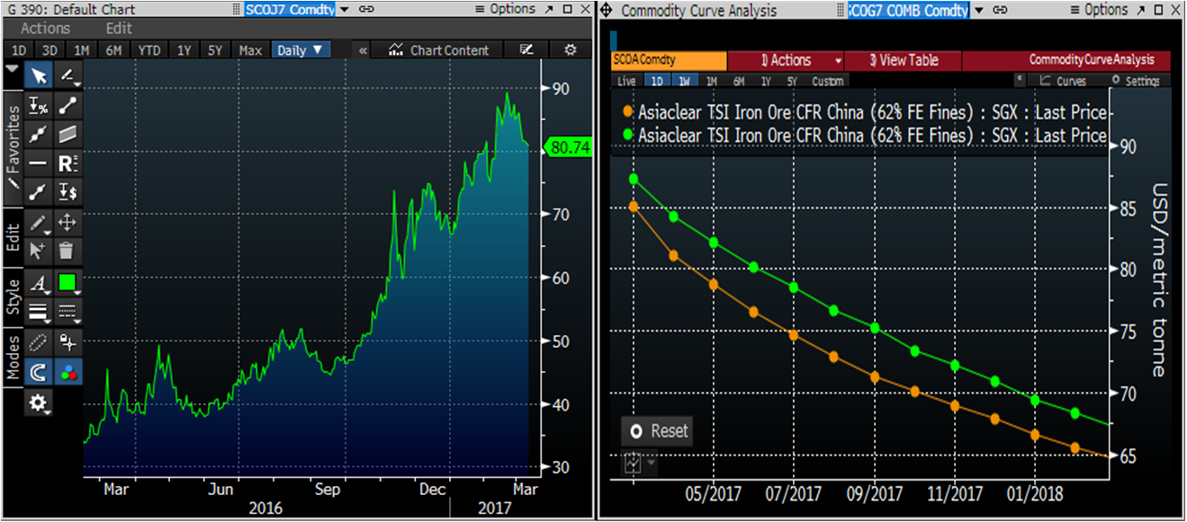 SGX iron ore futures have moved lower over the past week with April settling today at $81/t up $0.85 on the day. While prices have come off recent highs, the uptrend remains firmly intact. April ore futures have more than doubled over the last twelve months while the curve has remained extremely backwardated throughout. April 2018 futures are at $63.5/t; 22 percent below April, 2017 futures. At this time last year, April 2016 ore futures were backwardated 26 percent below April 2017 futures. So for anyone still hanging on to the notion that the shape of the futures curve is a reliable predictor of price direction, just look at the 12 month performance of April, 2017 ore futures. Don’t believe the hype!