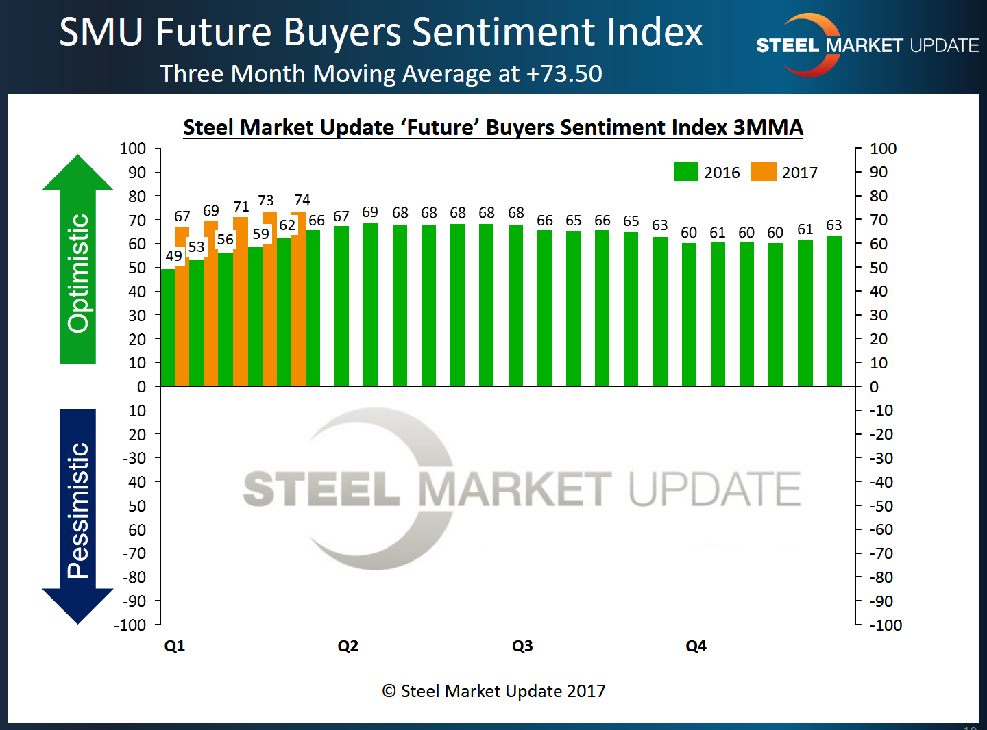 Buyers and sellers of flat rolled steel set a new record high for a single data point at +77 for our Current Sentiment Index. Our preference is to look at the data through a three-month moving average (3MMA) which helps smooth out any bumps in the data. On a 3MMA basis Current Sentiment is +73 which is also a new record high, one year ago our 3MMA was +53.17.
