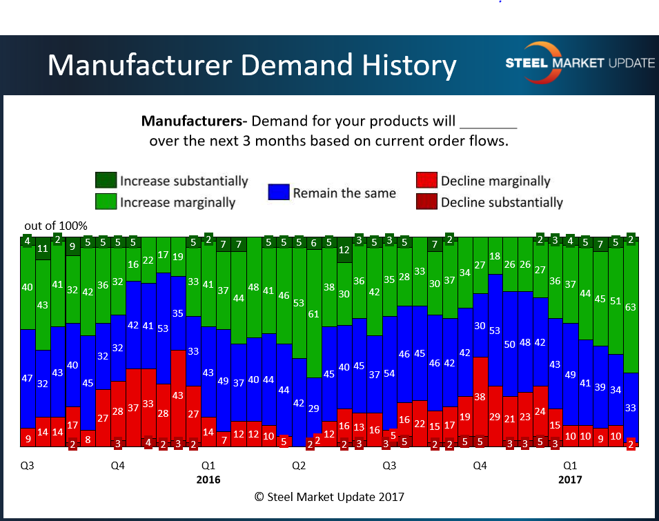 We don’t just take the service centers and wholesalers words to be gospel, we go out and ask the end users (manufacturers) to provide feedback about how they are seeing demand for their products. We specifically ask how demand for their products will be over the next three months based on current order flows. In last week’s analysis, we found 65 percent were reporting demand as increasing substantially (2 percent) or marginally (63 percent) with only 33 percent reporting things as staying the same and a modest 2 percent saying business will decline marginally. Compare that against year ago levels when 46 percent reported demand as growing, 44 percent remaining the same and 10 percent as declining marginally.