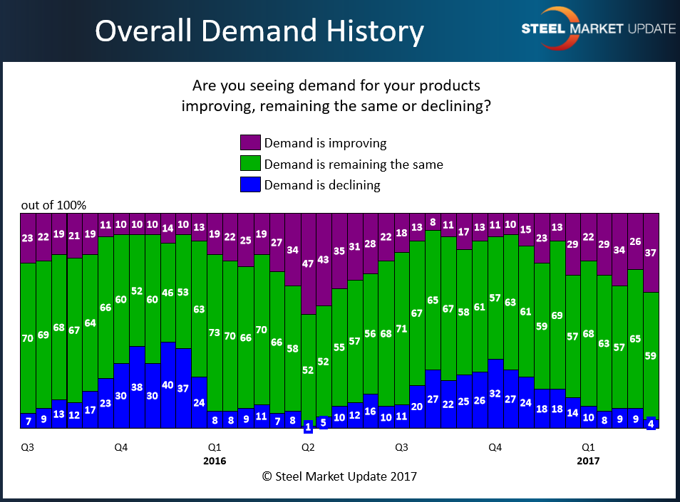 Demand is one of the key focal points for any of our market trends surveys as we strive to get a better handle on the market as a whole and then on individual market segments within the industry. Last week 37 percent of our respondents reported demand for their products as improving, 59 percent reported demand as remaining the same and only 4 percent pegged demand as in decline. That 4 percent is the lowest level measured since the 1 percent recorded during the first week of April 2016. The 37 percent reporting demand as improving is 10 percentage points better than what we saw one year ago.