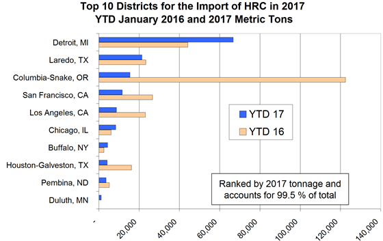 The chart shows graphically the tonnage of HRC that entered the top 10 districts in YTD January for 2016 and 2017 and is ranked by 2017 tonnage. These 10 districts account for 99.5 percent of the grand total in 2017. Detroit received the most tonnage in January 2017 and in January last year Columbia Snake had the highest volume.