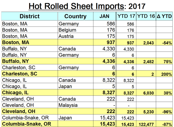 The table included here is a small extract from the data sheet for hot rolled coil. It describes the tonnage that has come in through Baltimore, Boston, Buffalo, Charleston, Chicago, Cleveland and Columbia Snake. It shows where it came from, the YTD tonnage and the YTD change compared to 2016. The total volume of HRC through January was down by 55 percent year over year but Buffalo and Chicago both had a large increase in tonnage.