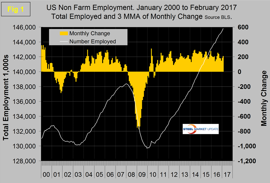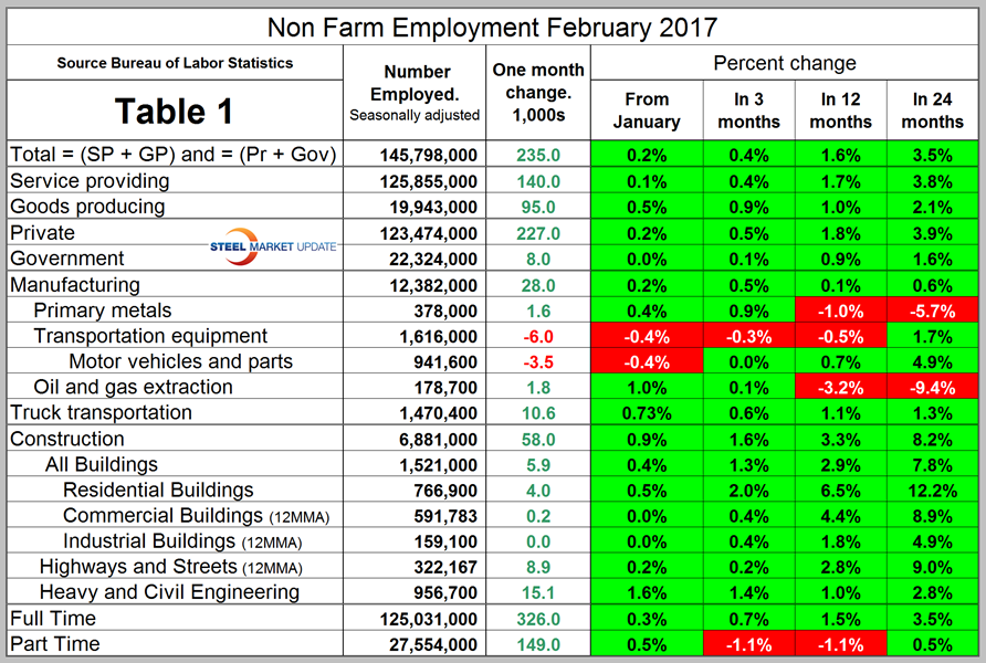 Total employment equals the sum of private and government employees: it also equals the sum of goods producing and service employees. Most of the goods producing employees work in manufacturing and construction and the components of these two sectors that we consider to be of most relevance to steel people are broken out in Table 1. In February, 227,000 jobs were created in the private sector and government gained 8,000. The Federal government gained 2,000 as local governments gained 9,000 and state governments lost 3,000. Since February 2010, the employment low point, private employers have added 16,217,000 jobs as government has shed 152,000. In February service industries expanded by 140,000 as goods producing industries driven by both construction and manufacturing expanded by 95,000. Since February 2010, service industries have added 13,749,000 and goods producing 2,316,000 positions. This is part of the reason why wage growth has been slow since the recession as service industries on average pay less than goods producing such as manufacturing.