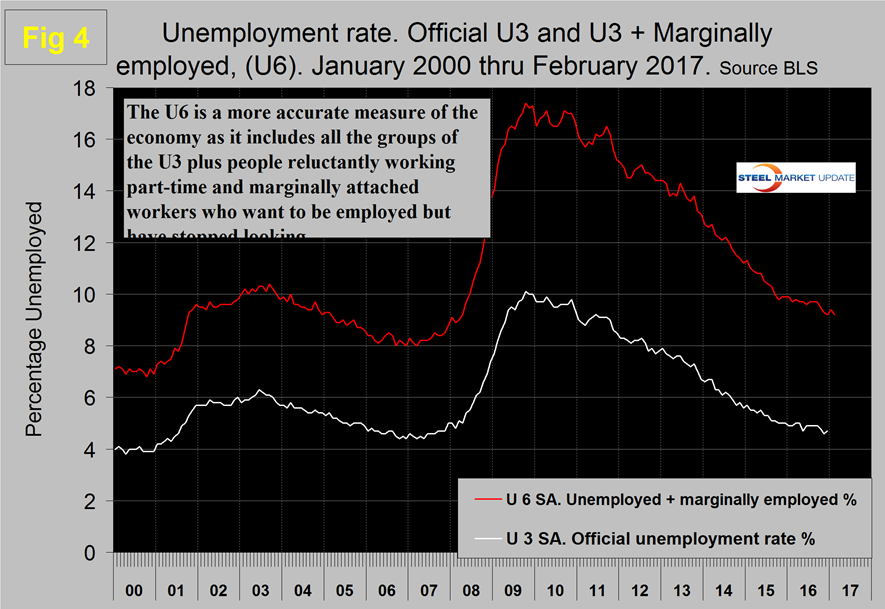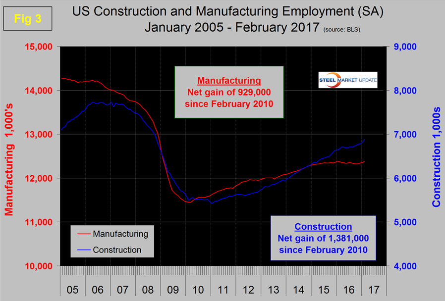 In February, manufacturing gained 28,000 positions for a total of 57,000 in the last three months. This was the best result for manufacturing since October 2015. In February, total manufacturing employment was 0.6 percent higher than the same month in 2015. Table 1 shows that primary metals had positive growth of almost 1 percent in the last three months. Transportation equipment including motor vehicles lost jobs in February but trucking was very strong. Oil and gas extraction gained 1,800 jobs in the preliminary February result which was 1.0 percent. Note the subcomponents of both manufacturing and construction shown in Table 1 don’t add up to the total because we have only included those that we think have most relevance to the steel industry.