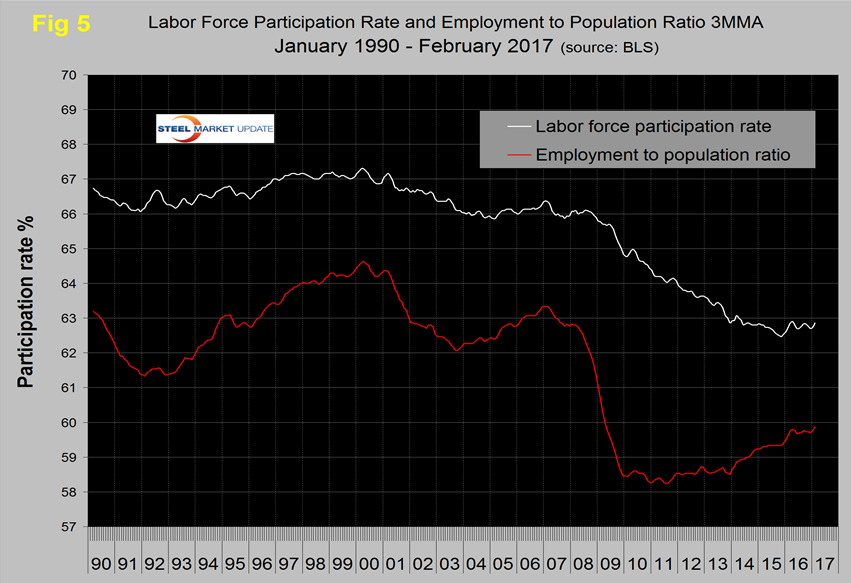 U6 includes workers working part time who desire full time work and people who want to work but are so discouraged that they have stopped looking. The differential between these rates was usually less than 4 percent before the recession but is still 4.5 percent. It has been estimated that the economy needs to create about 150,000 jobs per month to keep up with population growth. In the last 13 months the average job creation has been 194,000 so the impact on unemployment has been about 44,000/month. The employment participation rate is accurately reported in the press as going nowhere. In February 2017 the rate was 62.9 percent which was the same as March and April last year. We’re not sure that we understand what this is a percentage “of” because of the multiple descriptions of the labor pool. Another measure is the number employed as a percentage of the population which we think is much more definitive. In February this measure was 60.0 percent up from 59.8 percent in February last year. Until a year ago when it stalled, there was a gradual improvement in employment to population ratio since late 2011. Figure 5 shows both measures on one graph.