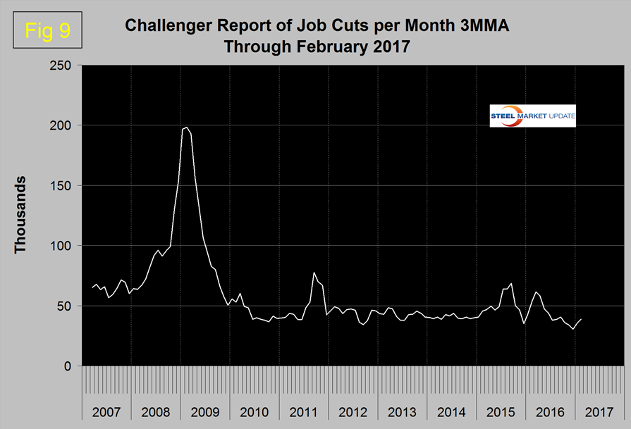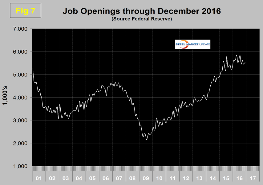 SMU Comment: Construction employment has benefited from the mild winter this year but the growth in manufacturing jobs in the last three months can’t be dismissed so easily therefore we are encouraged. February was the 76th consecutive month of job growth and in the last 14 months seven have exceeded 200,000 jobs created per month. The road hauling sector had its best month since December 2014 which we regard as a general economic indicator. Job losses in the oil fields have halted. The results for manufacturing and construction are sign posts for steel sales activity. In the big picture, layoffs are historically low and job openings are close to all-time highs therefore the year has started off well.