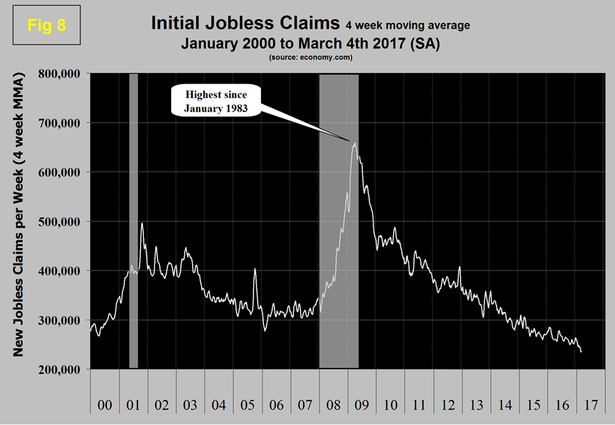 Initial claims for unemployment insurance, reported weekly by the Department of Labor have continued their downward drift this year and in w /e March 4th were 243,000 with a four week moving average of 236,500. This marks the longest streak since 1973 of initial claims below 300,000. (Figure 8). The result for w/e November 12th at 233,000 was the lowest since April 1974.