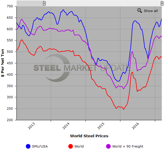 Below is a graph comparing SteelBenchmarker world HR export prices against the SMU domestic HR average price (we will build new data using Platts and replace the SteelBenchmarker data once we have collected a sizable history). We also have included a comparison with freight and traders’ costs added which gives you a better indication of the true price spread. You will need to view the graph on our website to use it’s interactive features, you can do so by clicking here. If you need assistance with either logging in or navigating the website, please contact us at 800-432-3475 or info@SteelMarketUpdate.com.