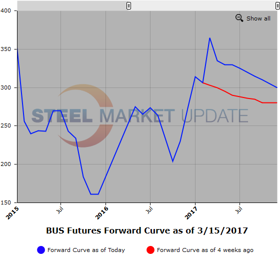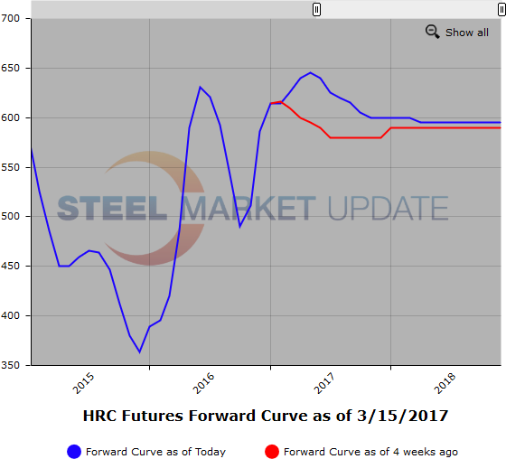 HR futures trading has been very muted this week as only 5,300 ST of futures traded since the latest round of mill price increase announcements and rising scrap prices. This past week the focus has been on balance of 2017 with Q3’17 the most active. The futures curve remains well backwardated. May’17 traded @ $648/ST and $647/ST and Q3’17 has traded at a weighted average of $609/ST. Note the May to July discount of just under $40/ST.