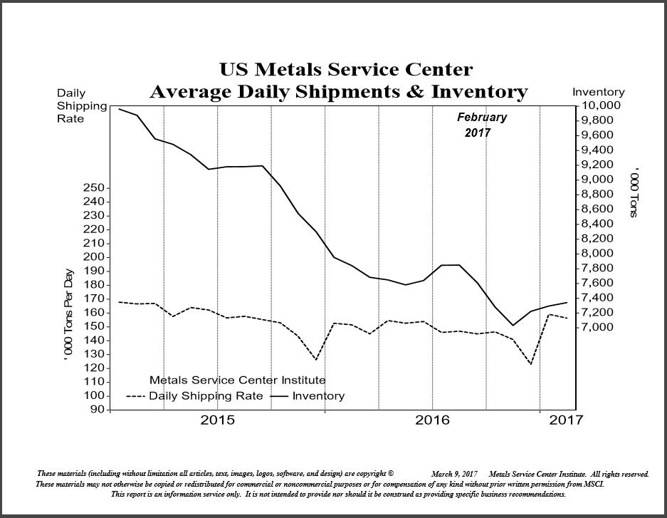 As of the end of February inventories of all steel products stood at 7,341,700 net tons down 6.4 percent from last year but slightly higher than the 7,341,700 tons reported as of the end of January 2017. The number of month’s supply is now 2.3 based on the data received from the MSCI.