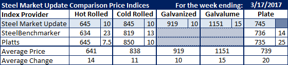 Cold rolled was up double digits on all three indexes but there is quite a spread between SteelBenchmarker and SMU/Platts. SteelBenchmarker has CRC at $819 per ton while SMU came in at $845 per ton and Platts at $850 per ton.