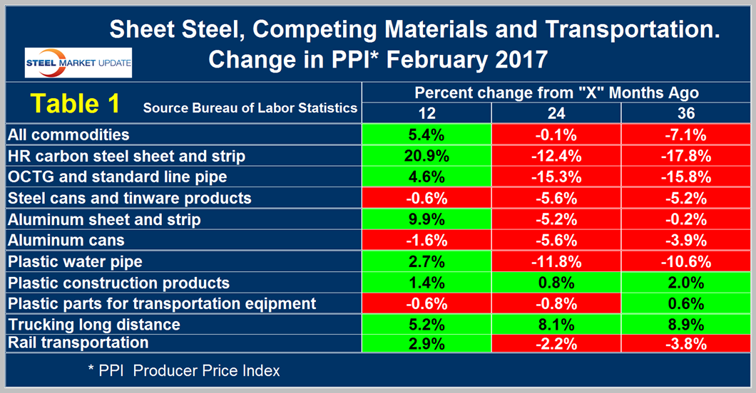 The gain/loss pattern as shown by the color codes in this latest update on a year/1 year basis is much better than in any of our reports since January 2015. Our analysis of the PPI data shows that commodity prices as a whole rose by 5.4 percent in 12 months through February, an improvement from the 7.1 percent decline in 36 months. If as expected the US dollar rises during the balance of the year as the Fed raises interest rates, there will be downward pressure on commodity prices. It is evident from Table 1 that carbon steel sheet increased by much more than aluminum sheet at the 12 month level, which was a recovery from the greater declines for steel at the 24 and 36 month levels. The change in the PPI of steel and aluminum cans has been similar over all three time periods. The PPI of OCTG increased in the last twelve months after severe declines in the previous two years. We understand that steel dominates in most oil production and refining applications as plastic is used more often in distribution, mostly of natural gas, to end users. The PPI of plastic piping improved in the last year after declining by less than OCTG in the previous two years. An analyst of Cleveland based Freedom Group Inc., told AMM that plastic made significant inroads in oil and gas pipe applications in 2009 through 2012 but since then inroads have slowed.