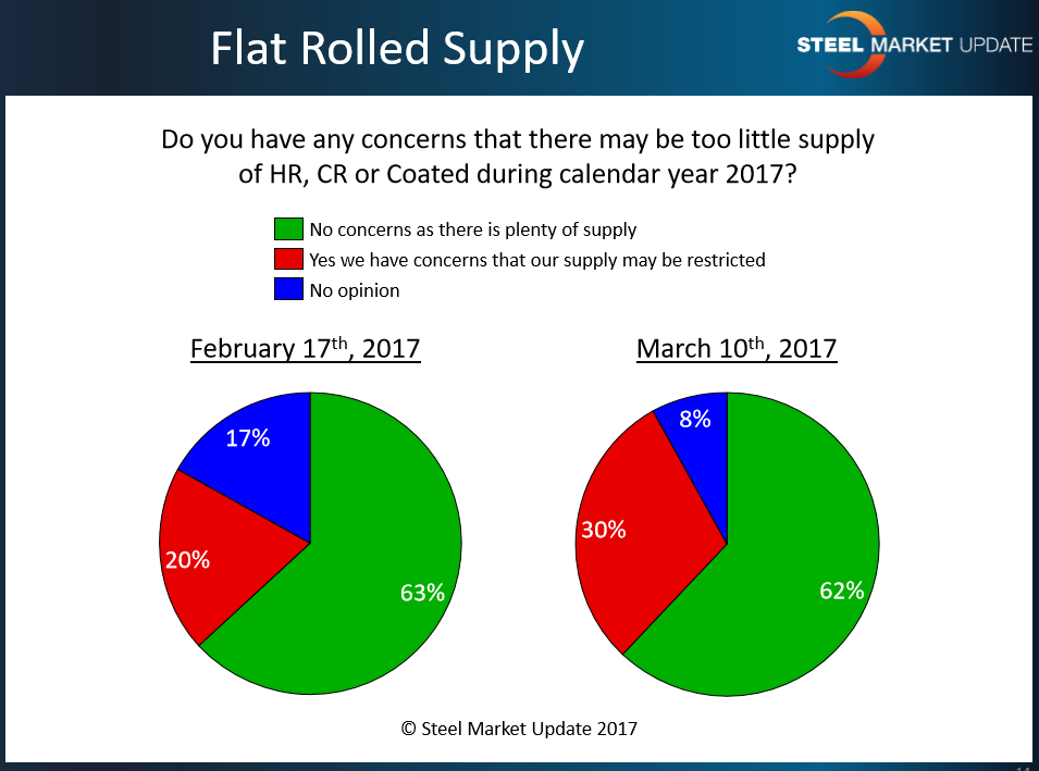 When we conducted our flat rolled market trends analysis during the middle of February we found 20 percent of our respondents had concerns regarding supply during calendar year 2017. The majority of respondents (63 percent) expressed no concerns about supply. As we move forward to last week the majority is still expressing no concerns about supply (62 percent) but the percentage of those having concerns has grown to 30 percent of our respondents. We will need to watch and see if there is cause for this concern either by extending lead times, shrinking imports or rapidly improving demand.
