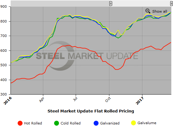 SMU Note: Below is a graphic showing our hot rolled, cold rolled, galvanized, and Galvalume price history. To use the graphs interactive capabilities, you must view it on our website here. If you need help navigating the website or need to know your login information, contact us at info@SteelMarketUpdate.com or by calling 800-432-3475.