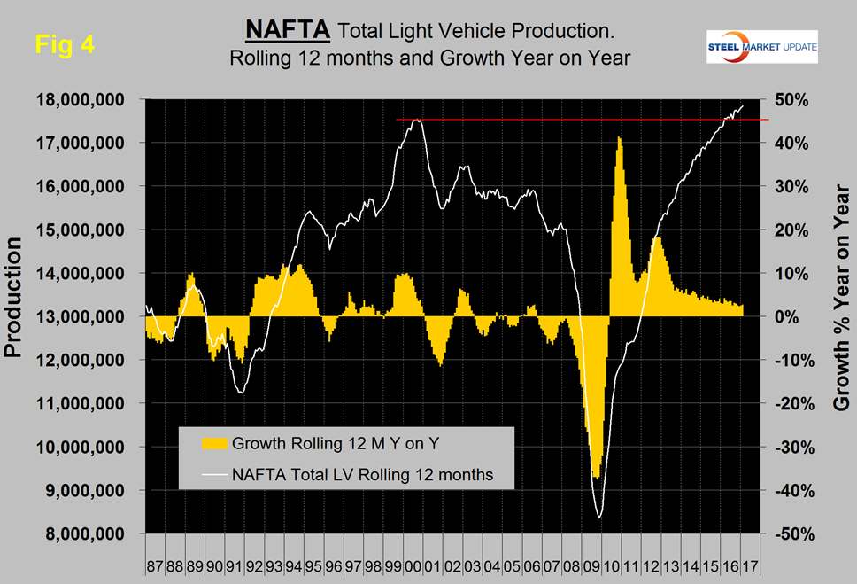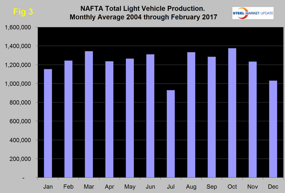 Total light vehicle (LV) production in NAFTA in February was at an annual rate, of 17.5 million units, up from 16.6 million in January and from 15.2 million in December. On average since 2004, February’s production has been 8.0 percent higher than January. This year production was up by 5.1 percent therefore slightly weaker than normal (Figure 3).