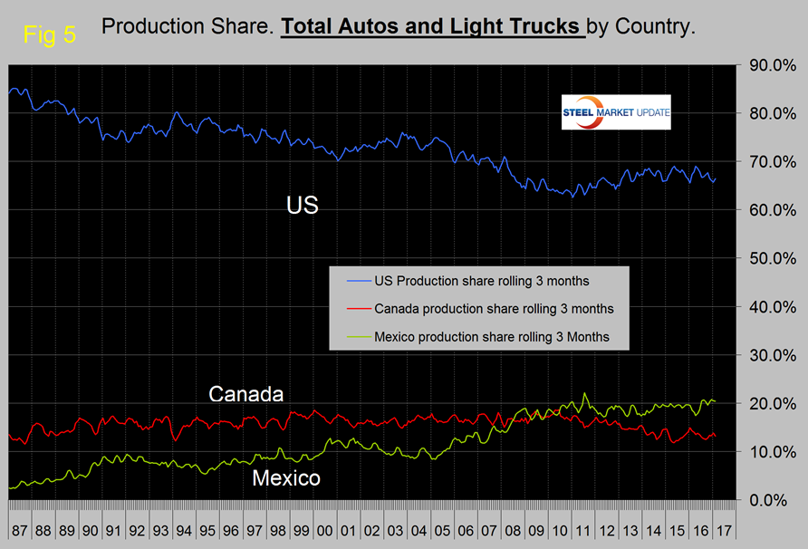 The eight months July through February were the first months for Mexico to have positive momentum after fourteen straight months of slowdown. Canada experienced negative momentum in July through February following very strong momentum in the previous six months. On a rolling 3 months basis y/y since early 2016, Mexico has gained production share mainly at the expense of Canada (Figure 5) and the Mexican and US shares have been almost mirror images of each other as production has shifted backwards and forwards across the border with not much net change.