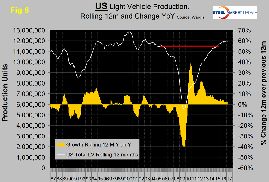 On a rolling 12 months basis y/y through February, LV production in NAFTA increased by 2.6 percent which was up from 2.5 percent in 12 months through January and 2.3 percent in 12 months through December. There has been a very gradual slowdown in growth for the last three years as indicated by the brown bars in Figure 4; however production has been higher than the previous all-time high every month since early 2016.
