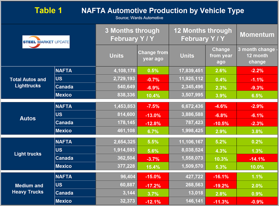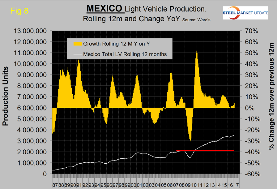 In February on a rolling three month basis, the US production share of total light vehicles was 66.4 percent which was lower than the 67.2 percent average for 2016. Canada’s was 13.2 percent which was worse than the 13.4 percent average for 2016. Mexico’s was 20.4 percent and was better than the 19.3 percent average for 2016. Production in Mexico was 3.194 million units, 3.386 million units and 3.458 million units in 2014, 2015 and 2016, respectively. The Mexican production target for 2020 is 5.0 million units according to Eduardo Solis, president of the Mexican Automotive Industry Association.