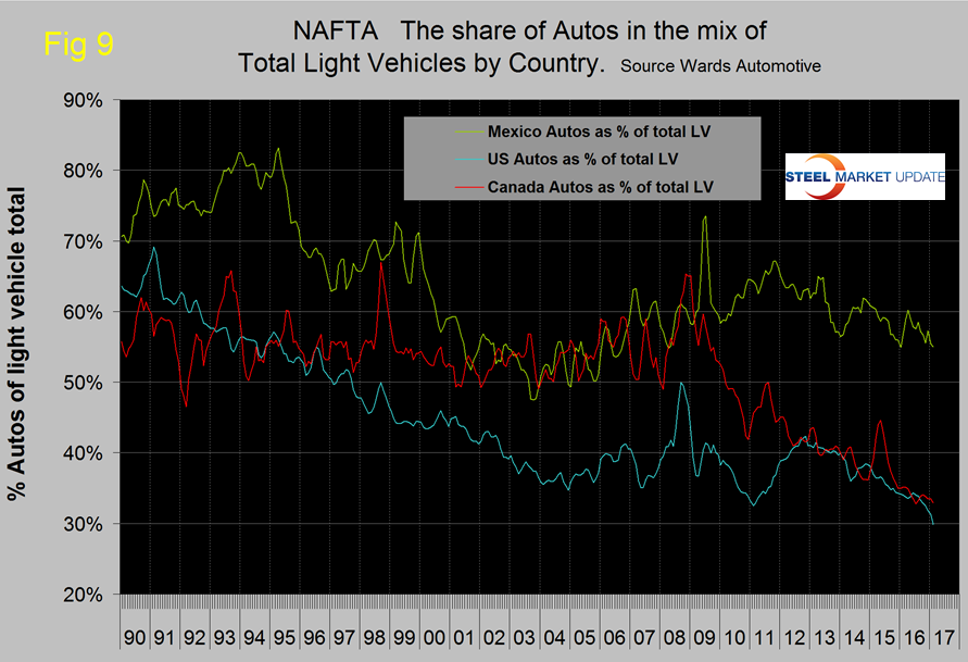 Figure 9 shows that the percentage of autos in the light vehicle production mix has been declining for all three countries since 2012, driven by consumer buying preferences which in turn are heavily influenced by gas prices.